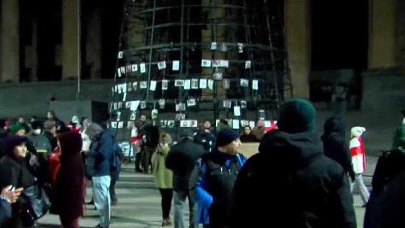აქციის მონაწილეები თბილისის მთავარ ნაძვის ხეზე, რომელსაც დედაქალაქის მერია პარლამენტის წინ დილიდან ამონტაჟებს, საპროტესტო აქციაზე დაშავებულების ფოტოებს ამაგრებენ.