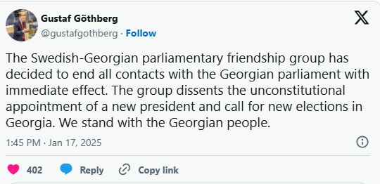შვედეთი-საქართველოს მეგობრობის ჯგუფი თბილისთან ყველანაირ კონტაქტს წყვეტს. ამის შესახებ, შვედეთის პარლამენტის წევრი, გუსტავ გოტბერგი აცხადებს.