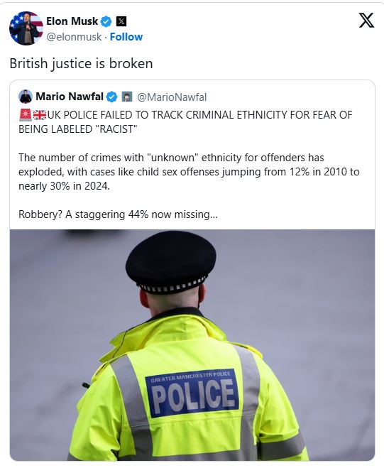 ბრიტანული მართლმსაჯულება მოშლილია, - წერს კომპანია SpaceX-ის დამფუძნებელი და ტრამპის ადმინისტრაციაში აშშ-ის მთავრობის ეფექტურობის დეპარტამენტის მომავალი თანახელმძღვანელი ილონ მასკი სოციალურ ქსელში და აზიარებს ინფორმაციას იმის შესახებ, რომ გაერთიანებული სამეფოს პოლიცია არ იძიებს კრიმინალთა ეთნიკურ წარმომადვლობას იმის შიშით, რომ „რასისტად“ არ შეირაცხოს.