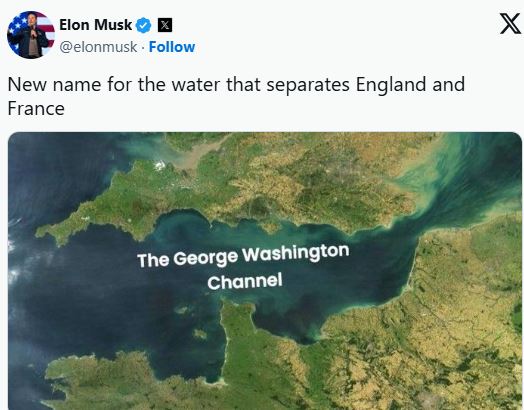 ლა მანშის სრუტის ახალი სახელი, რომელიც ყოფს ინგლისსა და საფრანგეთს – ჯორჯ ვაშინგტონის სრუტე“, – წერს მასკი სოციალურ ქსელში და ფოტოს აქვეყნებს.