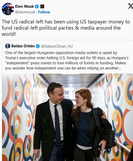 ილონ მასკი გამოეხმაურა უნგრეთის პრემიერ-მინისტრის, ვიქტორ ორბანის მრჩევლის, ბალაშ ორბანის განცხადებას, რომ უნგრეთის ერთ-ერთი უმსხვილესი ოპოზიციური მედია აღშფოთებულია ტრამპის განკარგულებით აშშ-ის საგარეო დახმარების 90 დღით შეჩერების თაობაზე.
