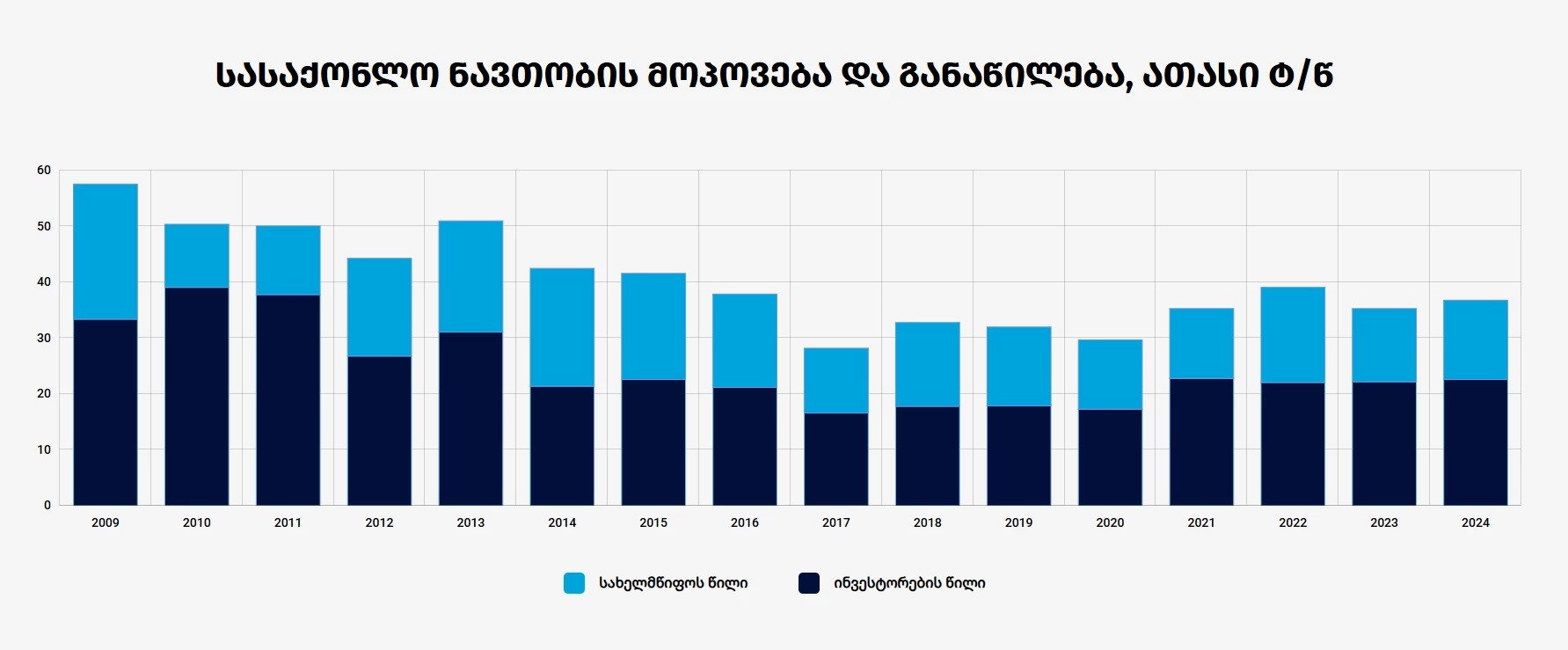 2010-2013 წლებში საშუალოდ 50 ათასი ტონის მოპოვება ხდებოდა, შემდეგ წლებში კი მოპოვება შედარებით შემცირდა.