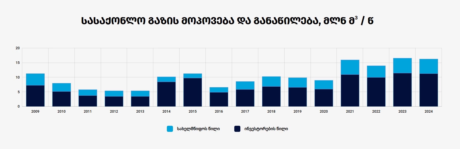 რაც შეეხება გაზის მოპოვებას - შარშან 15.8 მლნ კუბ. მეტრი გაზი მოპოვება მოხდა. კლება უმნიშვნელოა და 0.2 მლნ კუბ. მეტრს შეადგენდა. მოპოვებული გაზიდან სახელმწიფოს წილი 5 მლნ კუბ. მეტრი იყო. 2020 წლის შემდეგ სახელმწიფო ყოველწლიურად 4-5 მლნ კუბ.მეტრს იღებს ადგილობრივი მოპოვებიდან.