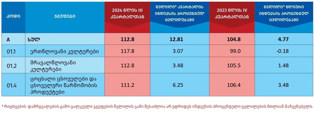 სოფლის მეურნეობის პროდუქტი IV კვარტალში წლიურად 4.8%-ით, III კვარტალთან შედარებით კი 12.8%-ით გაძვირდა.