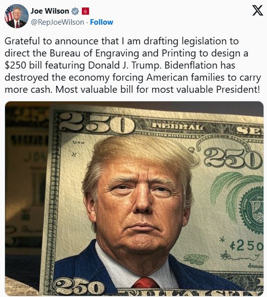 ამერიკელმა კონგრესმენმა, ჯო უილსონმა სოციალურ ქსელ X-ში დაწერა, რომ კონგრესში აშშ-ის პრეზიდენტის, დონალდ ტრამპის გამოსახულებით ახალი, 250 დოლარის ნომინალის კუპიურის შექმნის კანონპროექტს ამზადებს.