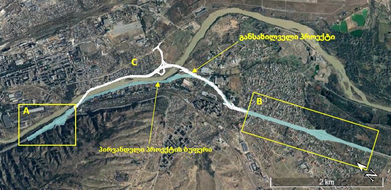 მდინარის მარცხენა სანაპიროზე გარდაბნის გზატკეცილთან დამაკავშირებელი კვანძის (IC1) შემდებ, კმ 7+030-დან კმ 7+140-მდე მესამე სახიდე გადასასვლელით საპროექტო ტრასა კვეთს მდინარე მტკვრის კალაპოტს, ამ მონაკვეთში მდინარე მტკვარი ორად იტოტება და შუაში წარმოქმნილია ე.წ „კუნძული“, - ვკითხულობთ დოკუმენტებში.