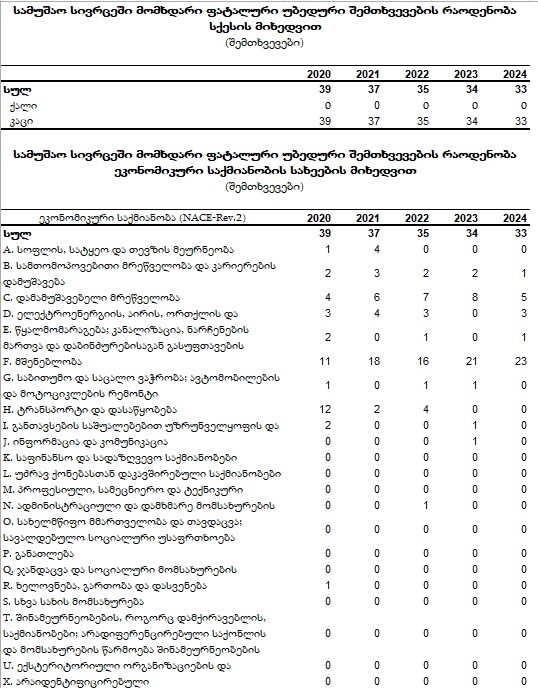 ბოლო 5 წლის განმავლობაში სამუშაო სივრცეში 178 ადამიანი დაიღუპა. 2020-2024 წლებში ყველაზე მეტი ადამიანი მშენებლობაზე მომხდარ უბედურ შემთხვევას ემსხვერპლა. მათ შორის 23 ადამიანი 2024 წელს.