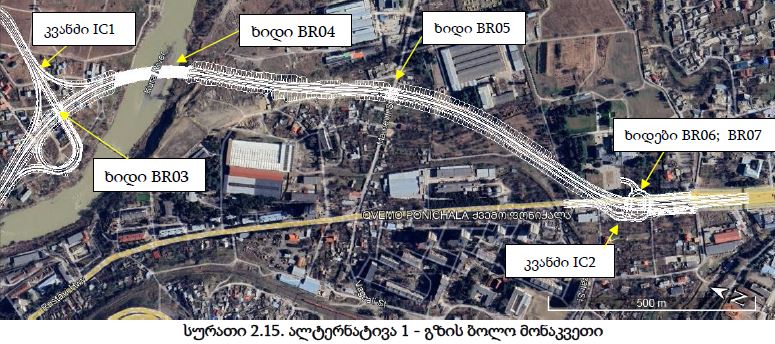 განახლებული პროექტის მიხედვით, საპროექტო გზის დერეფანი იწყება რკინიგზის ხიდის მახლობლად, მდინარე მტკვრის მარჯვენა სანაპიროზე და ხიდით გადადის მდინარის მეორე სანაპიროზე. მარცხენა სანაპიროზე გადასვლის შემდეგ მონაკვეთი გადის მდინარის გასწვრივ, დასახლებულ ზონას და მდინარეს შორის. საავტომობილო გზა კვეთს მტკვრის მარცხენა გვერდითი შენაკადის ხევს, სადაც იგეგმება სახიდე გადასასვლელის მოწყობა. გარდაბნის გზატკეცილთან დამაკავშირებელი კვანძის (IC1) შემდეგ, გზა ოთხმალიანი ხიდით უბრუნდება მარჯვენა სანაპიროს, გადის საწარმოო და დასახლებულ ზონას, სადაც ასევე ეწყობა სახიდე გადასასვლელი. საპროექტო გზა მეორე კვანძის (IC2) შემდეგ უერთდება თბილისი-წითელი ხიდის არსებულ საავტომობილო გზას, ქვემო ფონიჭალის ტერიტორიაზე. გარკვეულ მონაკვეთზე საპროექტო ტრასა მოწყობილი იქნება ყრილზე. სკოპინგის ანგარიშის მიხედვით, სახიდე გადასასვლელების მოწყობა დაგეგმილია ასევე კვანძების ფარგლებში. კერძოდ, პირველი კვანძის ფარგლებში გათვალისწინებულია ერთი, ხოლო მეორე კვანძის ფარგლებში ორი ხიდის მოწყობა. საპროექტო გზაზე დასაშვები სიჩქარე იქნება 80 კმ/სთ“, - აღნიშნულია პროექტში.