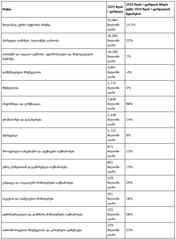 საქსტატმა საქართველოს კერძო სექტორის მაჩვენებლები გამოაქვეყნა. ანგარიშის თანახმად, 2025 წლის პირველ კვარტალში საქართველოს კერძო სექტორის ბრუნვა წინა წლის ანალოგიურ პერიოდთან შედარებით 14.5%-ით გაიზარდა და მან 55.9 მილიარდი ლარი შეადგინა.