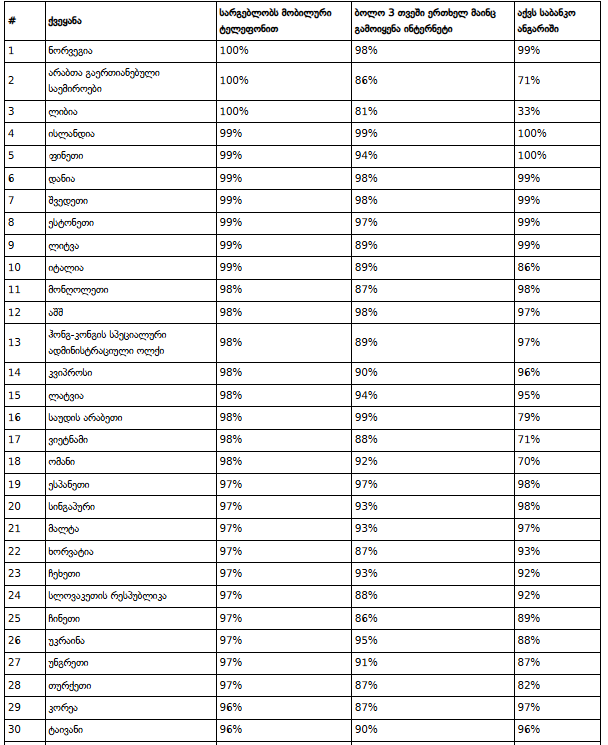 ანგარიშის თანახმად, საქართველო მობილური ტელეფონით სარგებლობის ინდიკატორში მსოფლიოში 42-ე ადგილს იკავებს. ამასთან, მობილური ტელეფონით სარგებლობის 100%-ის მოცვაა ნორვეგიაში, UAE-სა და ლიბიაში. ისლანდიაში, ფინეთსა და დანიაში, ასევე შვედეთსა და ესტონეთში მოსახლეობის 99%-ს აქვს მობილური ტელეფონი. რაც შეეხება ინტერნეტის მოხმარებას, საქართველოში ბოლო 3 თვეში ინტერნეტი ერთხელ მაინც მოიხმარა 15 წელს ზემოთ მოსახლეობის 82%-მა, რითაც მსოფლიოში 63-ე ადგილს იკავებს, ხოლო საბანკო ანგარიში მოსახლეობის 79%-ს აქვს, რითაც მსოფლიოში 54-ე პოზიციაზეა.