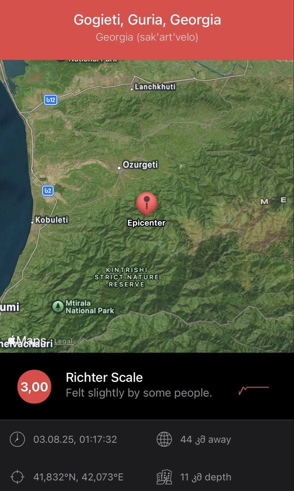 მიწისძვრის ეპიცენტრი ოზურგეთის რაიონის სოფელი გოგიეთი იყო.