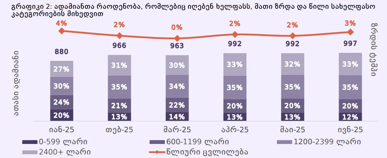 მიმდინარე წლის ივნისში იმ ადამიანების რაოდენობა, რომლებიც იღებდნენ 600 ლარამდე თვიურ ხელფასს, 12.4%-ს შეადგენდა, რაც მაისთან შედარებით 0.2 პროცენტული პუნქტით, ხოლო 2024 წლის ივნისთან შედარებით 3.3 პროცენტული პუნქტით შემცირებული მაჩვენებელია. ეს ნიშნავს, რომ 600 ლარამდე ხელფასი ქვეყანაში 123 ათასზე მეტ (123 670)ადამიანს აქვს.