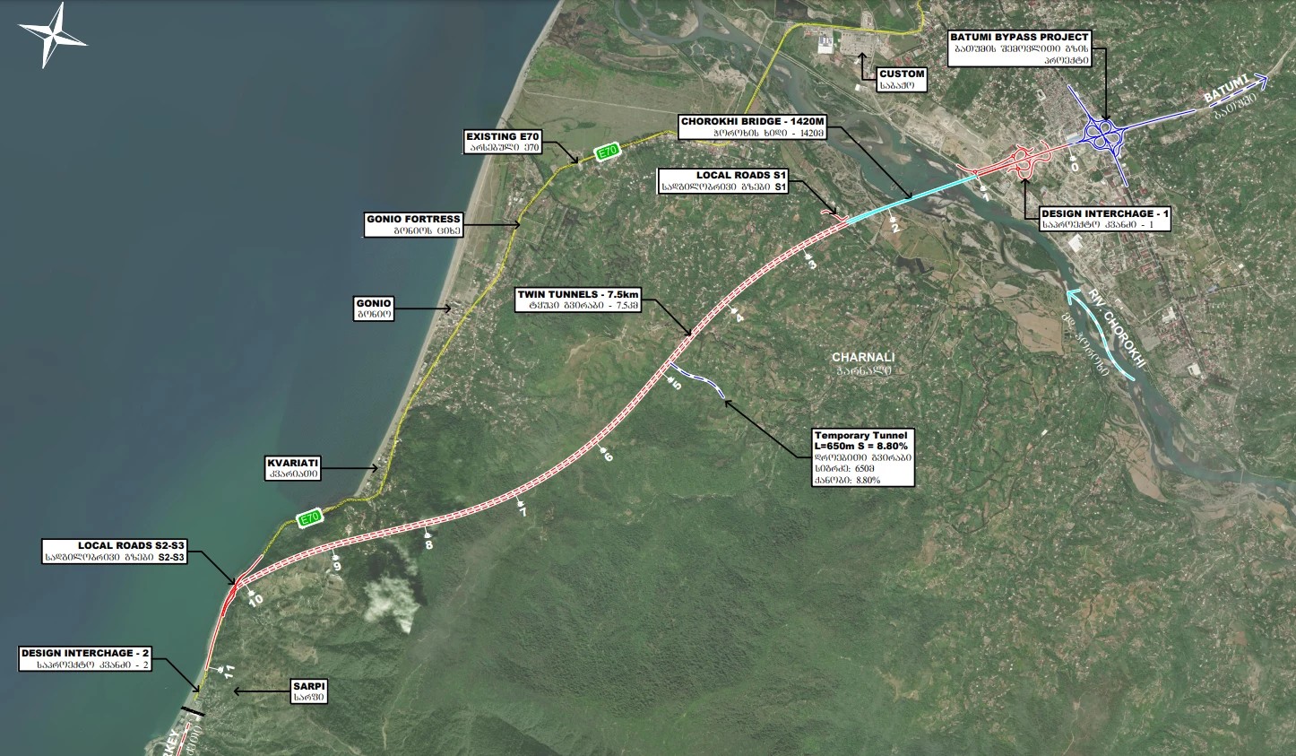 „დაგეგმილია ოთხზოლიანი კვანძის მოწყობა გზის დასაწყისში, ორზოლიანი ხიდის მშენებლობა მდ.ჭოროხზე, ორზოლიანი გვირაბის მშენებლობა და ოთხზოლიანი მონაკვეთის მშენებლობა სამხრეთი პორტალის შემდეგ არსებულ გზასთან შეერთების ზონაში. ინფრასტრუქტურა მოემსახურება ორივე მიმართულებით მოძრავ სატრანსპორტო ნაკადებს. გზის დასაწყისში დაგეგმილია ბათუმის აეროპორტისკენ და გონიოსკენ საპროექტო გზის დასაკავშირებლად კვანძის მოწყობა, რომელიც უზრუნველყოფს ბათუმის შემოვლითი გზიდან აეროპორტის მიმდებარე ზონაში არსებულ საბაჟოსკენ სატრანსპორტო ნაკადის გატარებას.