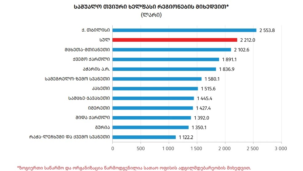 რეგიონების მიხედვით, ყველაზე მაღალი - 2,553 ლარის ხელფასი თბილისშია, ხოლო ყველაზე დაბალი კი რაჭა-ლეჩხუმსა და ქვემო სვანეთში - 1,122 ლარის ოდენობით.