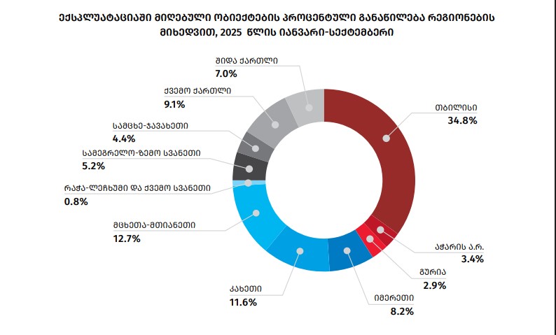 ექსპლუატაციაში მიღებული ობიექტების ორ მესამედზე მეტი მოდის ქვეყნის 4 რეგიონზე, კერძოდ, 34.8 პროცენტი მოდის თბილისზე, 12.7 პროცენტი - მცხეთა-მთიანეთის რეგიონზე, 11.6 პროცენტი - კახეთის რეგიონზე და 9.1 პროცენტი - ქვემო ქართლის რეგიონზე.