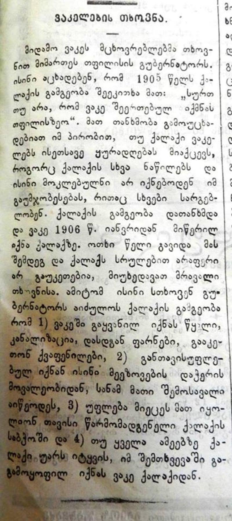 "მიდამო ვაკეს მცხოვრებლებმა თხოვნით მიმართეს თფილისის გუბერნატორს, ისინი აცხადებენ, რომ 1905 წელს ქალაქის გამგეობა შეეკითხა მათ სურთ თუ არა რომ ვაკე შეერთებულ იქმნას თფილისზეო. მათ თანხმობა გამოუცხადებიათ იმ პირობით, თუ ქალაქი ვაკელებს ისეთსავე ყურადღებას მიაქცევს, როგორც ქალაქის სხვა ნაწილებსა და ისინი მოკლებულნი არ იქნებოდნენ იმ გაუმჯობესებას, რითაც სხვები სარგებლობენ. ქალაქის გამგეობა დათანხმდა და ვაკე 1906 წლის იანვრიდან მიწერილ იქნა ქალაქზე.